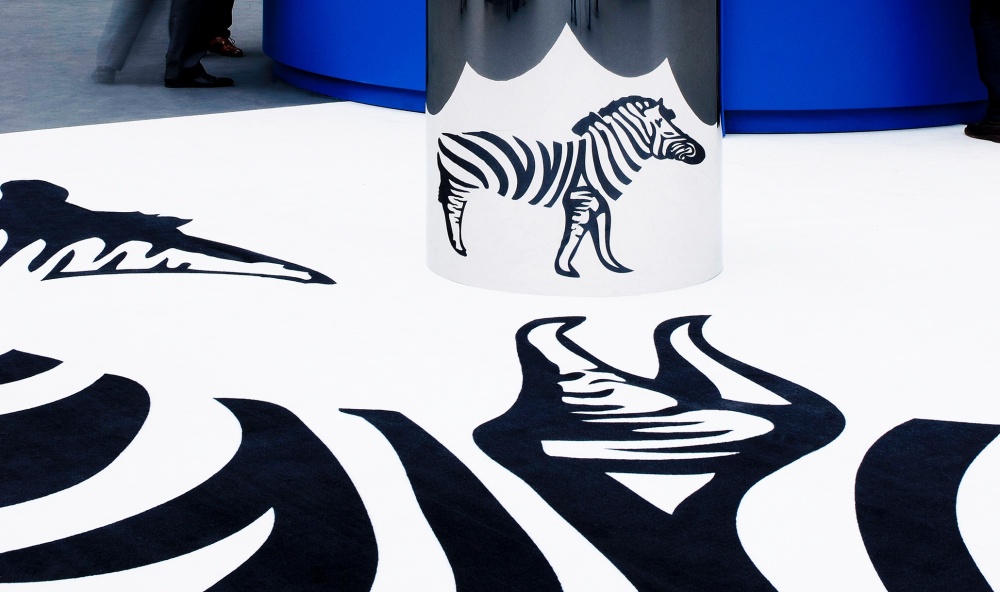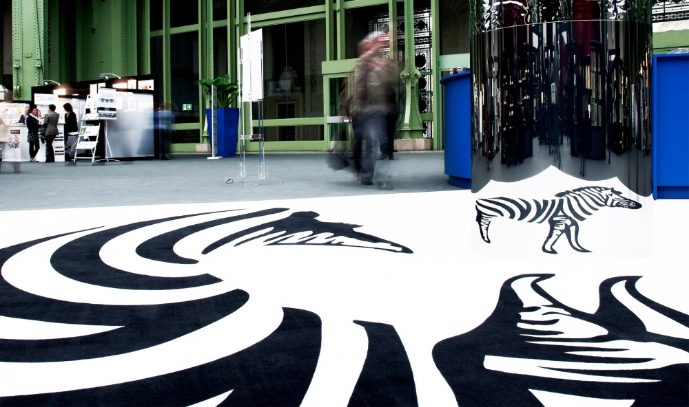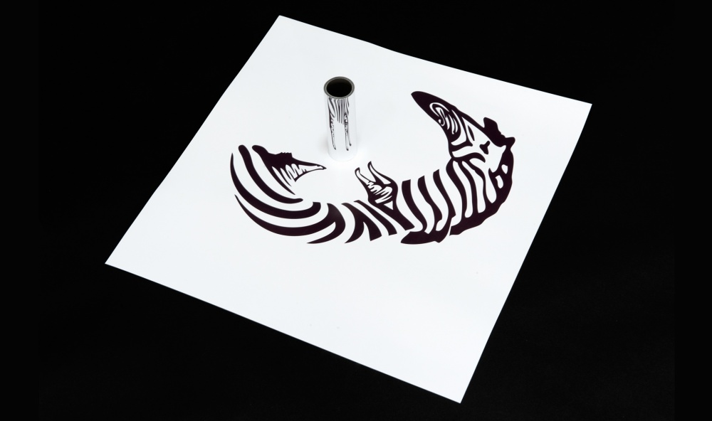 In 2013, the Library of the Natural History Museum was honoured by the Salon du Livre Ancien et de L'Estampe at their annual bookfair. Out of respect for this prestigious institution, LWA designed an art installation representative, in its own way, of natural history. Scienctists continue to be intrigued by this curious animal. Why do zebras have stripes ?  Extremely visible on the savannah, it has long been considered an exception to the rule of camouflage. However, in 2012, research suggested otherwise. The zebras' stripes were found to act as camouflage against horseflies. These insects, harmful to many mammals, use polarised light to locate their « prey », however, the  stripes offer a stroboscopic effect which disrupts the flies ability to see the zebra. The prinicpal of an optical illusion was applied to the work Razzle Dazzle. During the First World War, this technique, based on intersecting motifs, was widely used to protect boats from enemy fire. The installation which symbolises the zebras'« camouflage », as highlighted by naturalists, is a cylindrical anamorphosis. A distorted image of the animal with the famous stripes is reflected on a convex surface  to reveal a perfect representation.