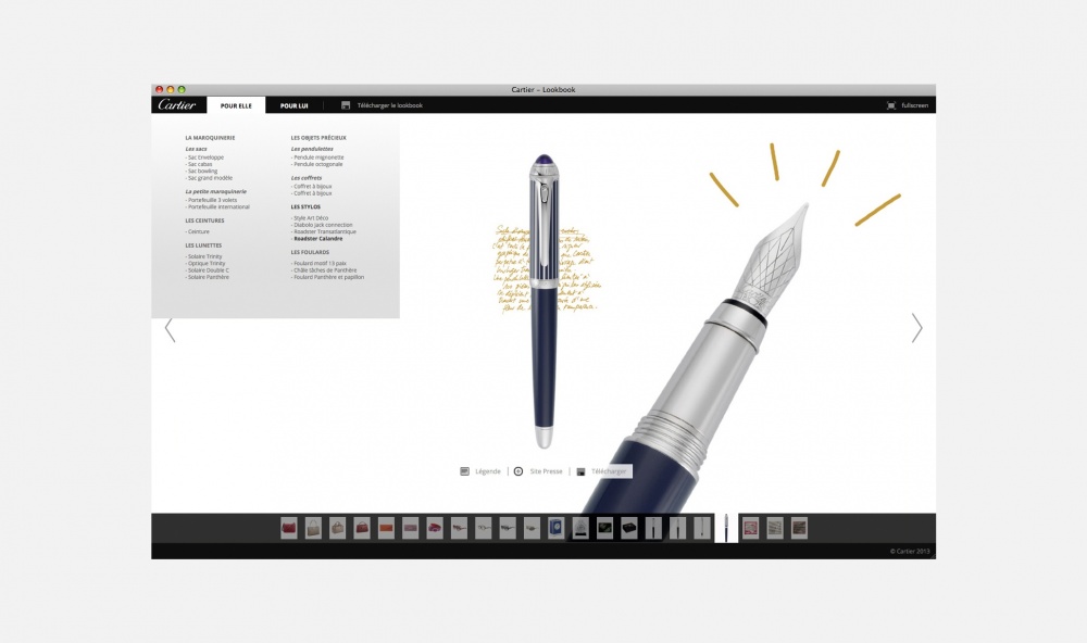 Pens, sunglasses, lighters, scarves, belts... Cartier presents its new accessories collection 2013. The promotional site reveals the sleek lines of these creations from the luxury house. A digital gallery exhibits the accessories in a lively and dynamic fashion. Each piece is suspended in the centre of the page, attracting all the attention, with a distinguished and minimalist aesthetic. Far from being superfluous the accessory becomes essential. The lighting captures all the details of the iconic brand – the three rings, the stirrup... - like the savoir-faire of its craftsmen. Sketches, fine drawing, poetic propositions drawn or written in gold, underline certain accessories. Elegant touches of humour that marry well with the French chic characteristic of Cartier. LWA was responsible for the art direction of the project, from design to production and the online launch of the digital gallery. Journalists can navigate the collection hommes/femmes with ease, thanks to the ergonomic design, and download the 2013 catalogue.