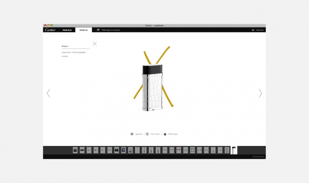 Stylos, lunettes de soleil, briquets, foulards, ceintures… Cartier présente sa nouvelle collection accessoires 2013. Le site promotionnel révèle les lignes pures des objets de la luxueuse maison... Une galerie numérique expose les accessoires suivant un enchaînement vif et dynamique. Aérienne, chaque pièce, au centre de la page, attire toute l’attention, par une esthétique distinguée et minimaliste. Loin d’être superflu, l’accessoire devient alors l’essentiel. La mise en lumière saisit les moindres détails emblématiques de la marque — les trois anneaux, l’étrier… —, comme le savoir-faire historique de ses artisans. Lignes, fines esquisses, propositions poétiques, dessinées ou écrites en or, surlignent certains accessoires. Élégantes pointes d’humour qui s’allient admirablement au chic à la française, caractéristique de la maison Cartier. LWA a pris en charge la direction artistique du projet, depuis son design jusqu’à la production et la mise en ligne de la galerie numérique. Les journalistes notamment peuvent naviguer avec facilité dans la collection hommes et femmes, grâce à une ergonomie améliorée, et télécharger le fichier du catalogue 2013.